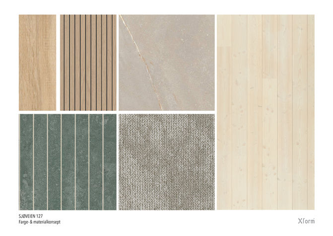 Målet med materialkonseptet er å skape ei heilheitleg, naturleg og balansert atmosfære. Dei ulike golva skal ha noko lunde same fargetone for å knytte huset saman. Fargepaletten skal heller ikkje oppfattast kontrastfull, men likevel vere den største stemnings-settande faktoren og ha ei aktiv rolle i interiøret. Kvitlasert furu og lys varm eik gjev eit lyst men varmt utgangspunkt. Fargar som plomme, blått, terracotta, grøn og beige er fargar henta frå naturen og skapar dermed ei fin heilheit sjølv om fargane skiljer seg frå kvarandre. Kontrastfargar som gul og rosa, samt meir kullørsterke tonar av hovudfargane, er det som skapar dynamikk og dybde i konseptet.