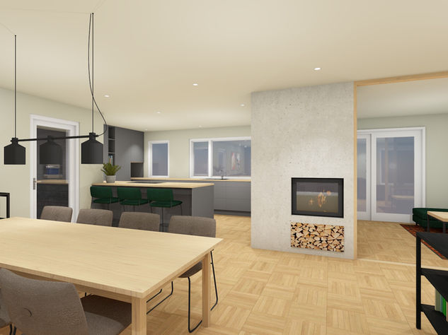 I dette prosjektet er det teikna ny planløysing i hovudetasje for ei meir opa løysing mellom kjøkken og stove. Det er óg utarbeida eit nytt overflatekonsept for golv, veggar og himling.