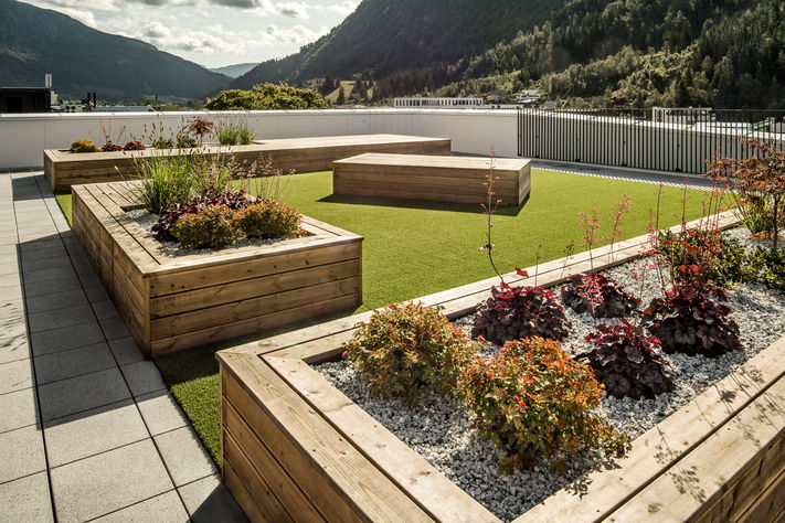 Bygget inneheld næringslokaler i 1.-2. etasje, samt leilegheiter i 3.-5. etasje, takterrasse og parkeringsgarasje.
